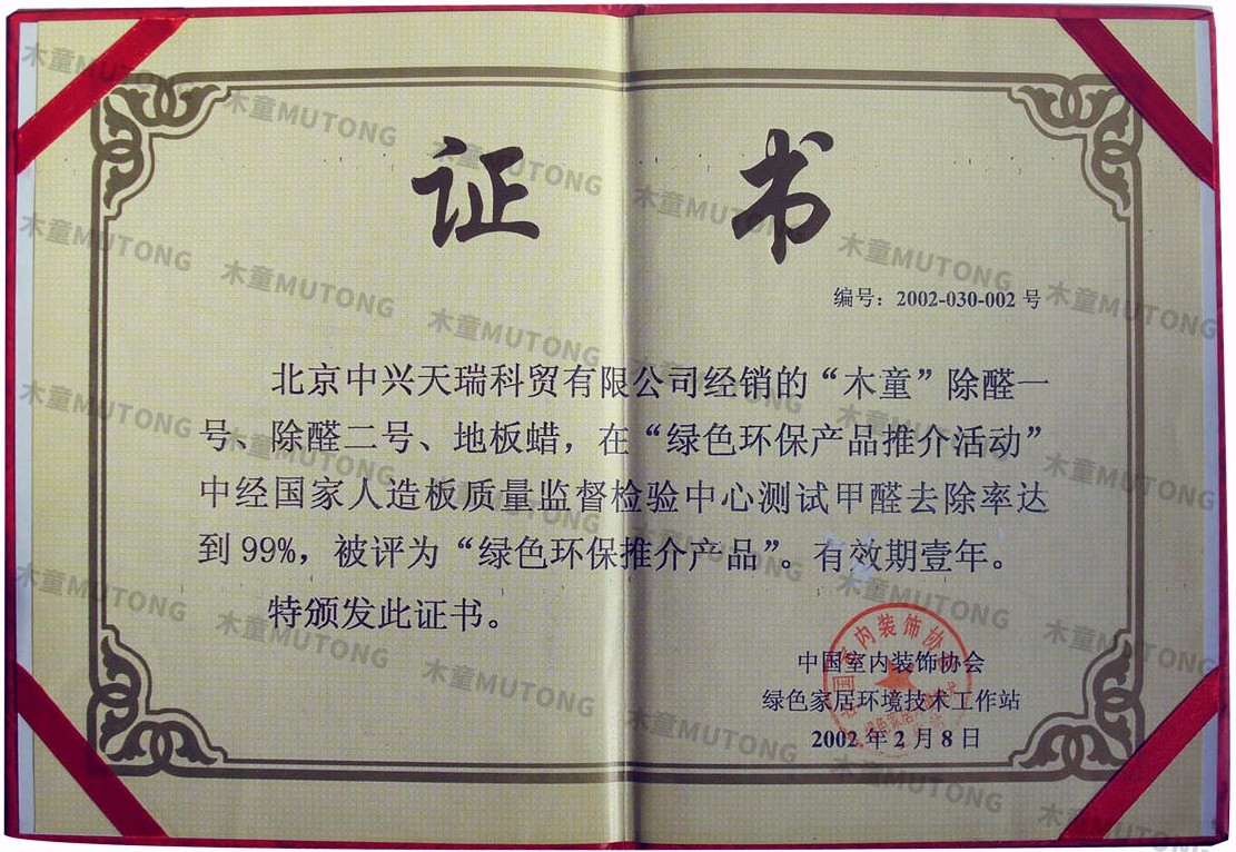 木童除甲醛一號(hào)二號(hào)、地板除甲醛蠟獲2002年綠色環(huán)保推介產(chǎn)品證書(shū)
